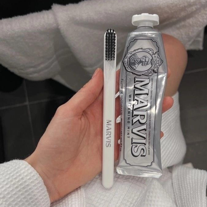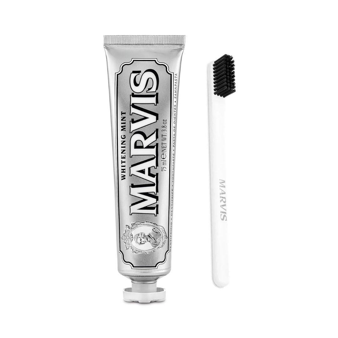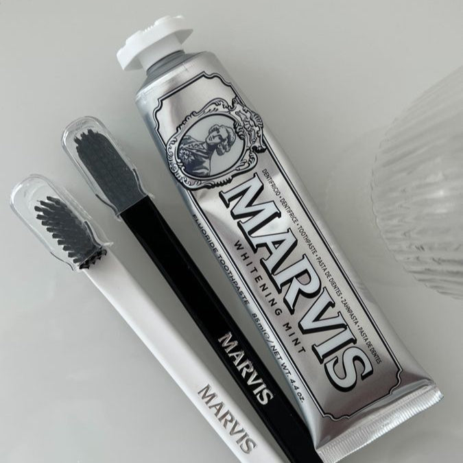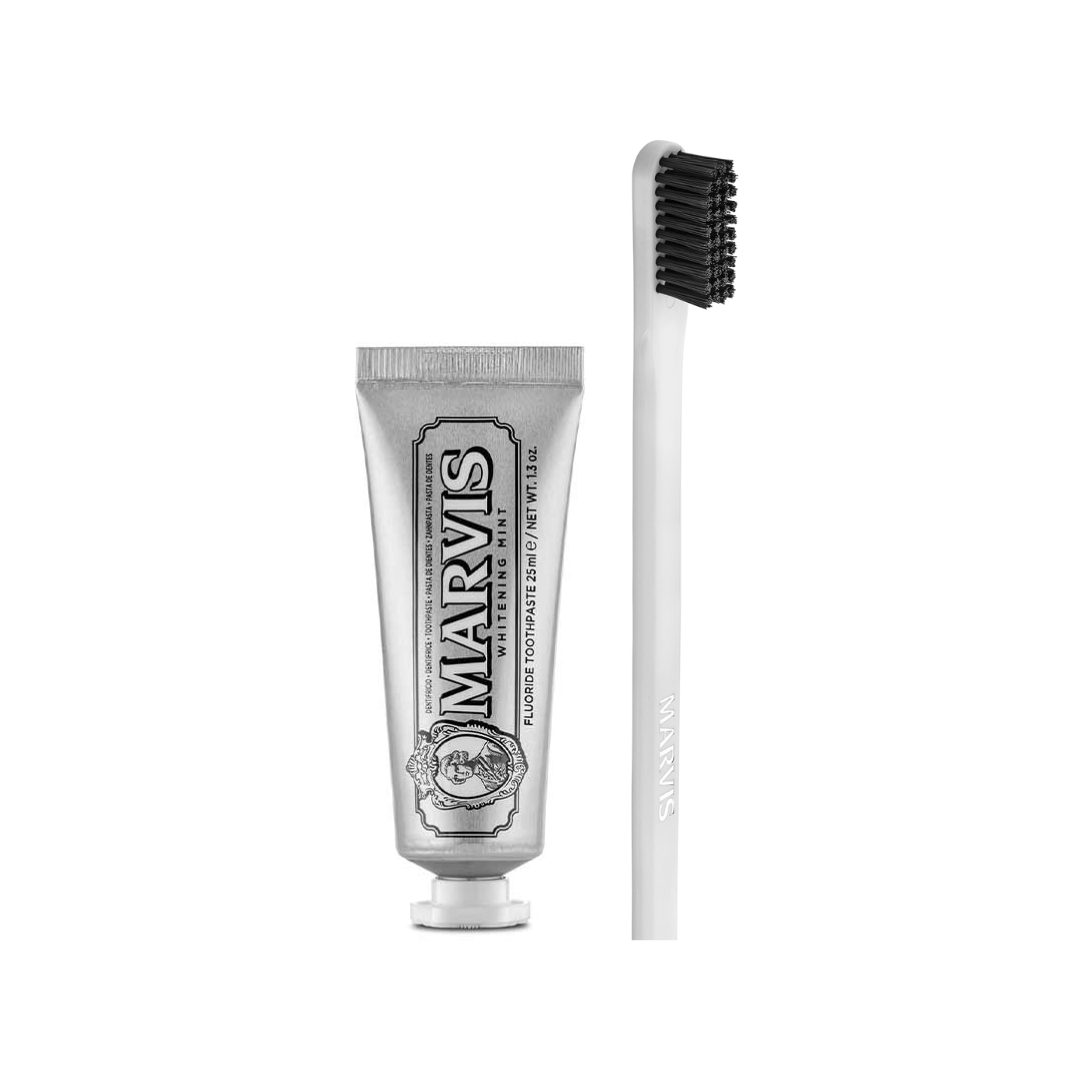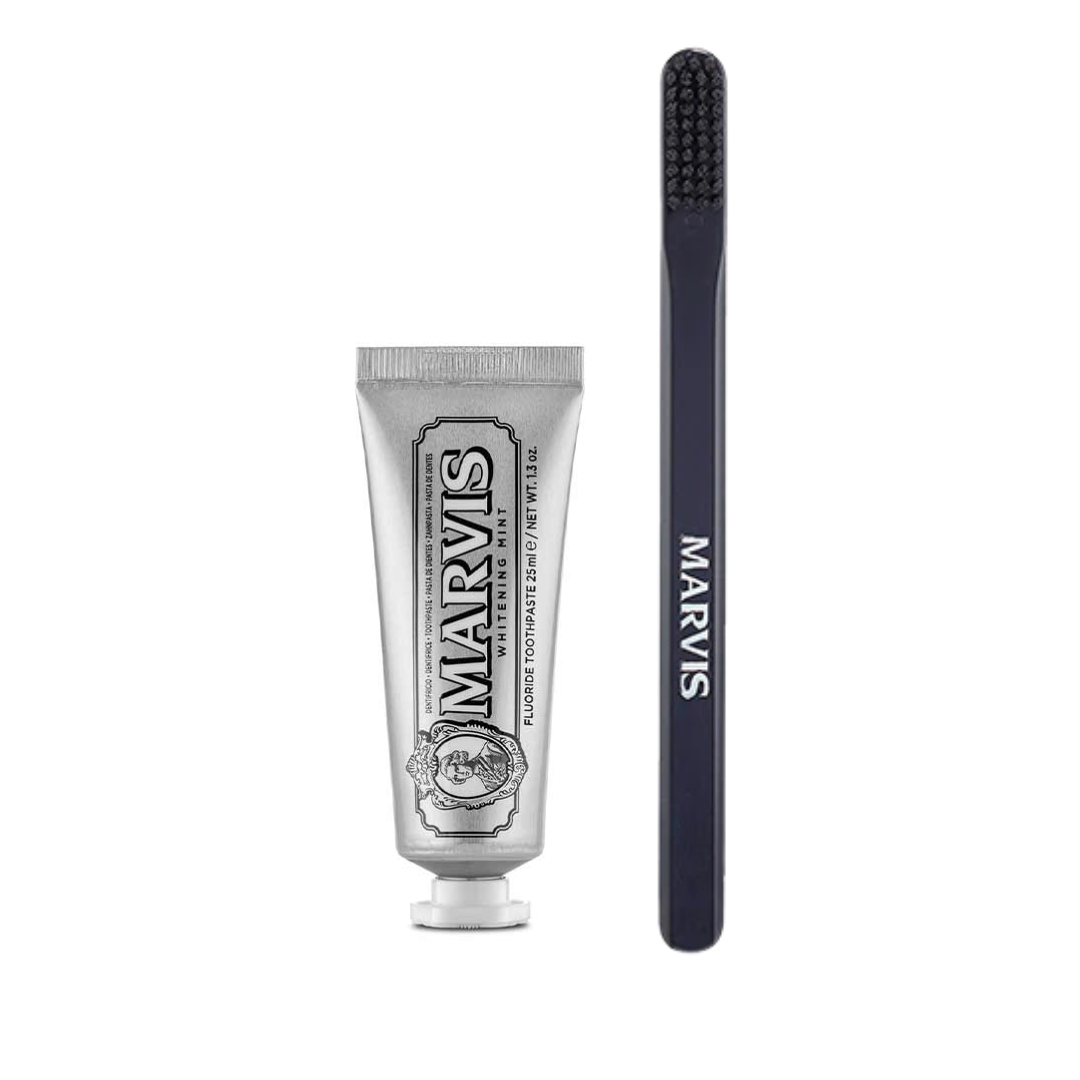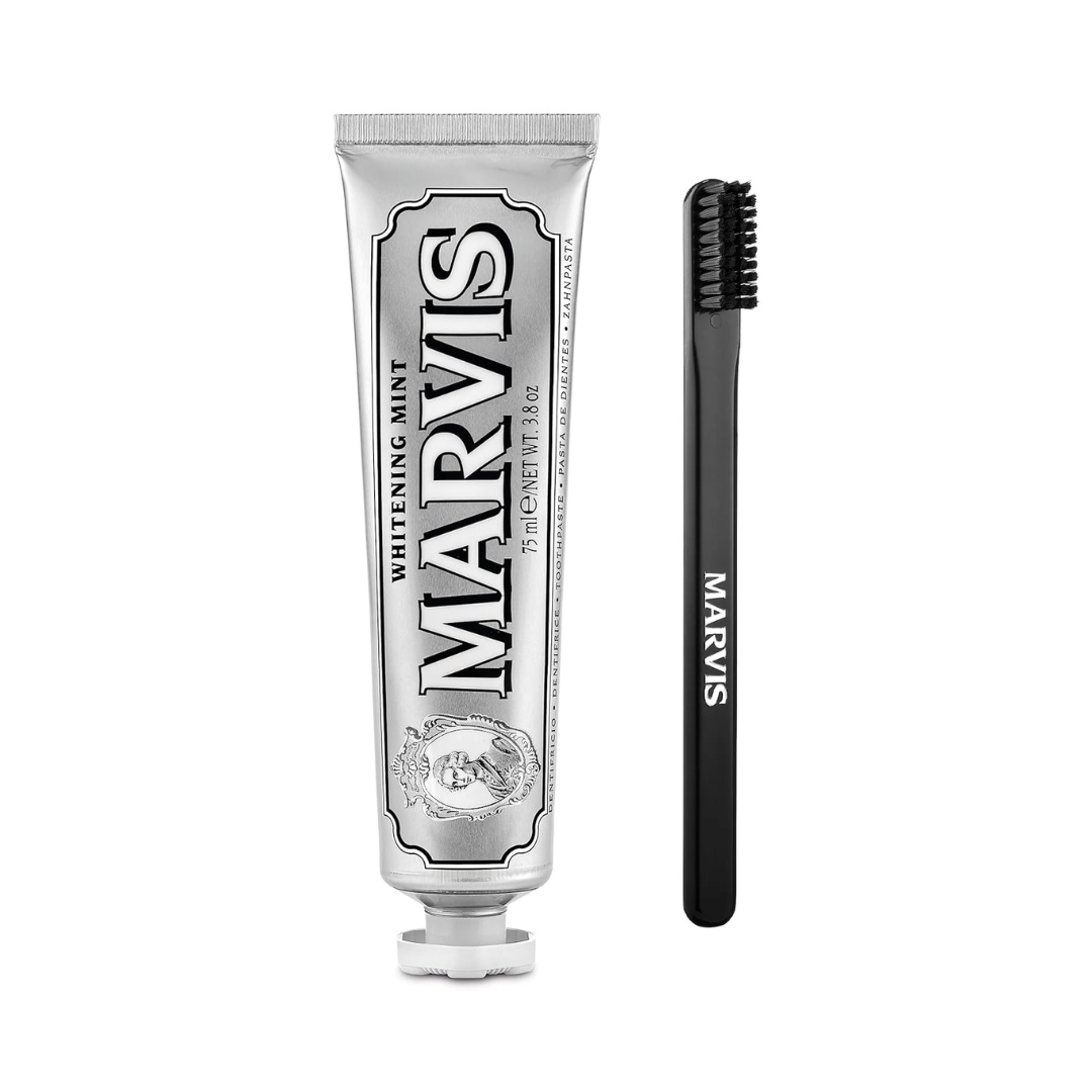 The Marvis Duo es un set de cuidado bucal que incluye una pasta dental de 75 mL y un cepillo de dientes, disponibles en blanco y negro. Combina diseño elegante con una limpieza eficaz y un sabor fresco característico de Marvis.